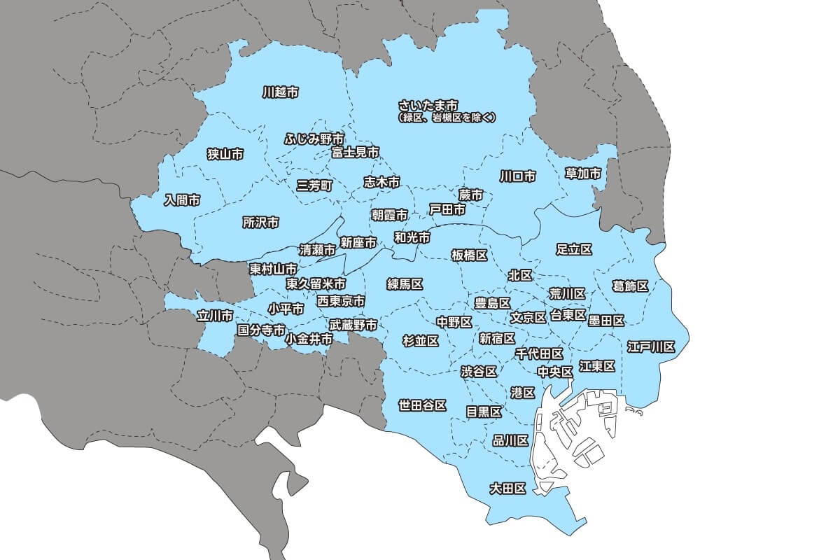 さいたま市浦和区、さいたま市岩槻区、さいたま市見沼区、さいたま市桜区、さいたま市西区、さいたま市大宮区、さいたま市中央区、さいたま市南区、さいたま市北区、さいたま市緑区、越谷市、吉川市、戸田市、三郷市、所沢市、新座市、川口市、草加市、朝霞市、八潮市、北葛飾郡松伏町、北葛飾郡杉戸町、和光市、蕨市、久喜市、五霞町、幸手市、宮代町、春日部市、志木市、富士見市、三芳町、入間市、狭山市、ふじみ野市、川越市、鶴ヶ島市、坂戸市、川島町、桶川市、上尾市、伊奈町、蓮田市、白岡市